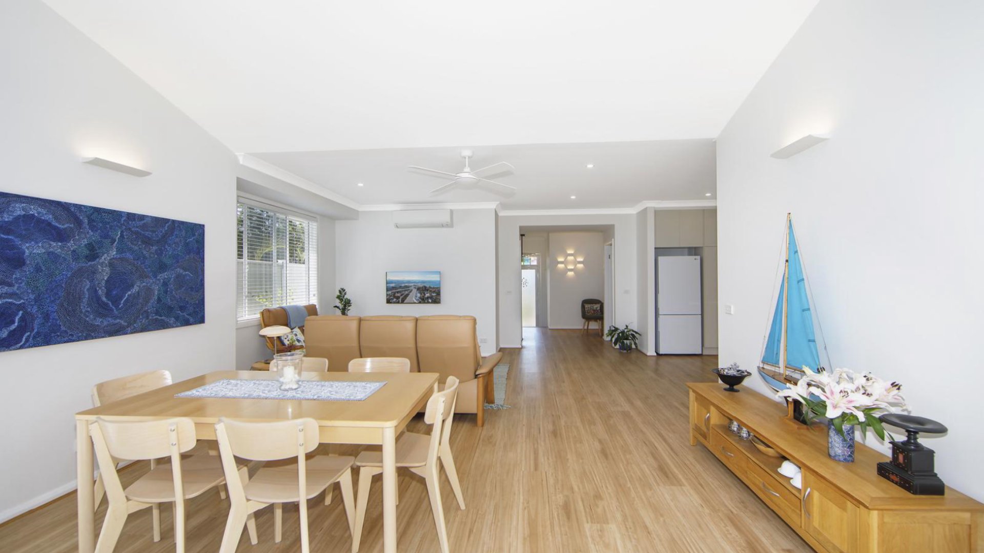 - Air-conditioning and floorboards in living area, carpeted bedrooms, dining area seats 6