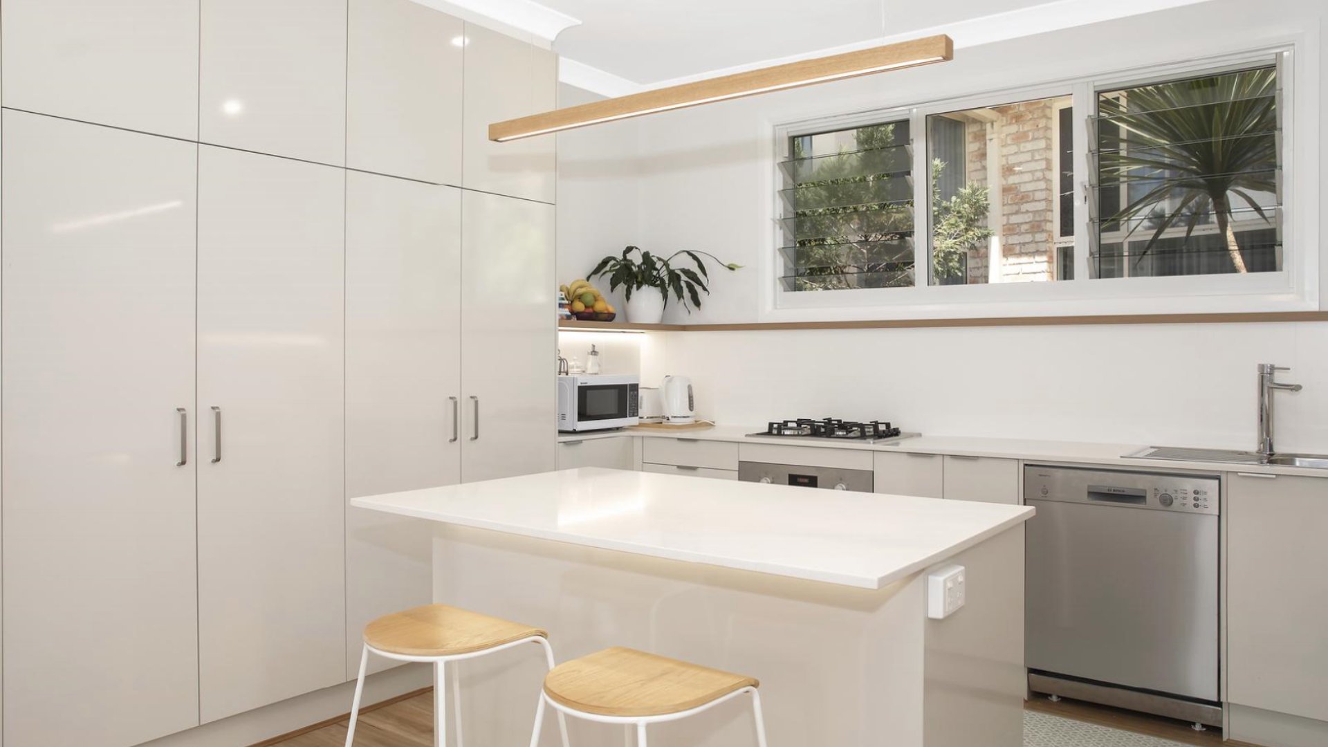 - Fully equipped kitchen with oven, gas cooktop, dishwasher, and microwave